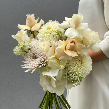 A beautiful, creamy and warm bridal bouquet. Special and carefully selected rings. The stylish shape of the bouquet will suit the modern bride.