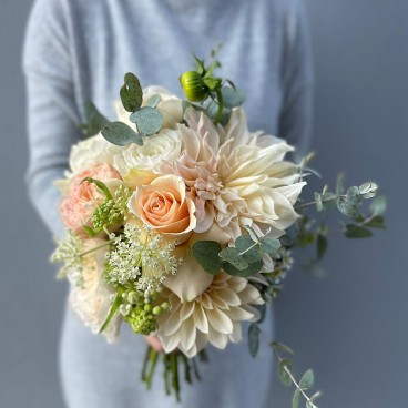 A beautiful, creamy and warm bridal bouquet. Special and carefully selected rings. The dahlias you see in the photo are available in August-September. At other times we will change them seasonally.