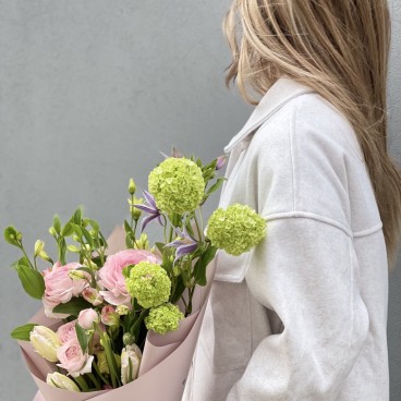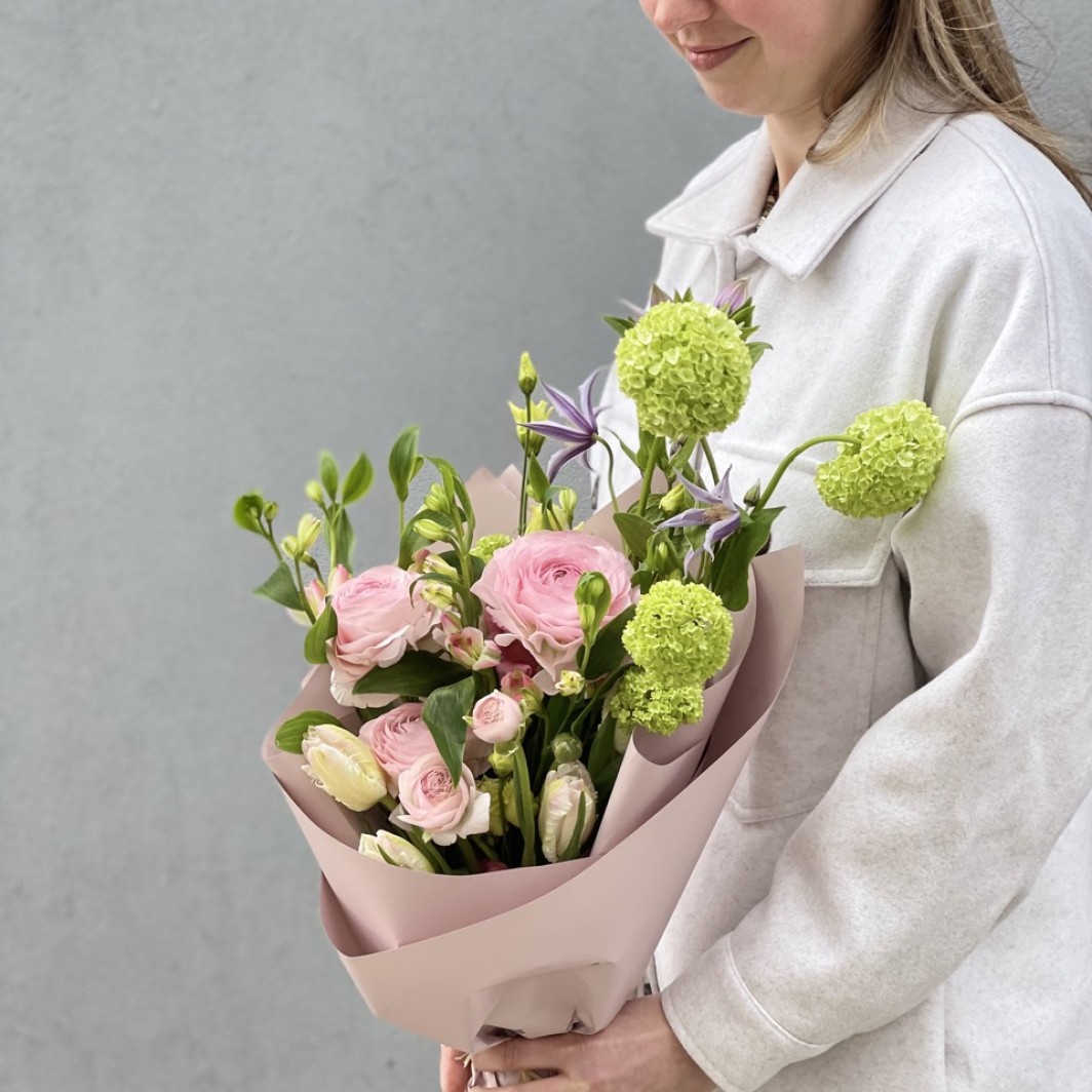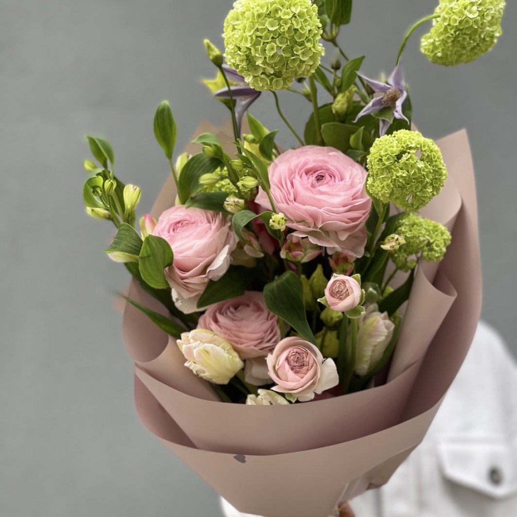 Morning magic - a spring bouquet with fresh greenery, beautiful buttercup flowers and tulips.