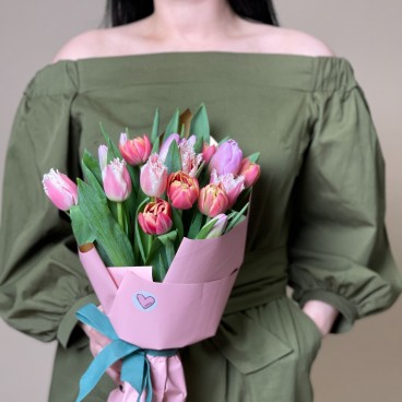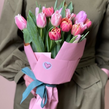 Puokštę sudaro įvairios derančios tulpės supakuotos į dekoratyvinį popierių.