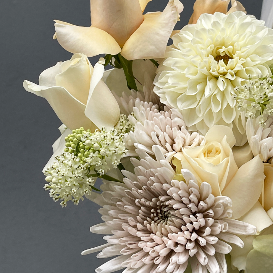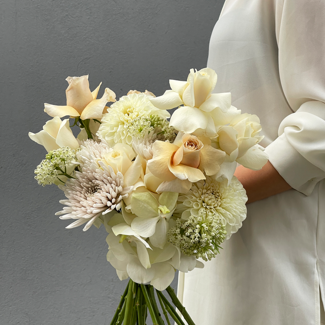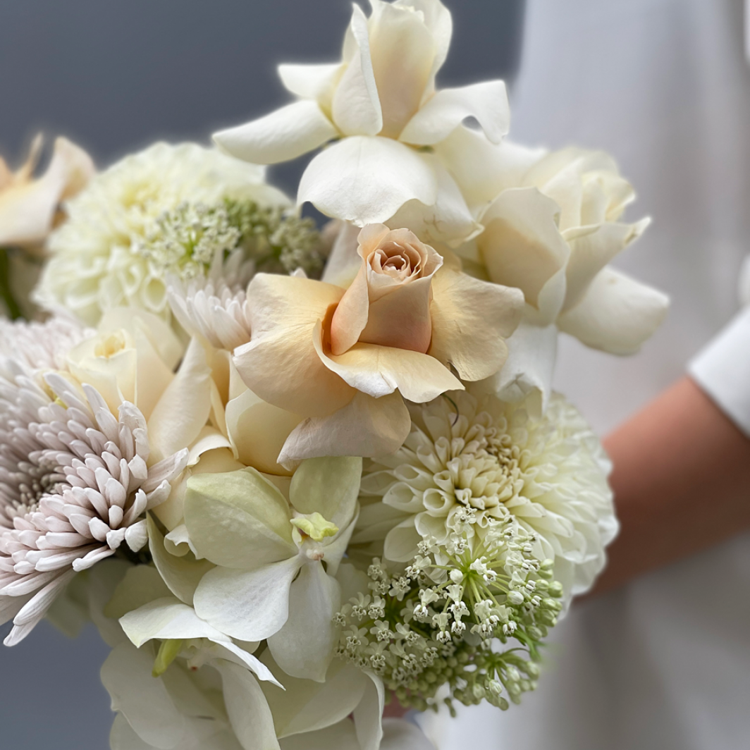 Nuostabi, kreminė ir šiltų atspalvių nuotakos puokštė. Ypatingi ir kruopščiai atrinkti žiedai. Stilinga puokštės forma tiks šiuolaikiškai nuotakai.